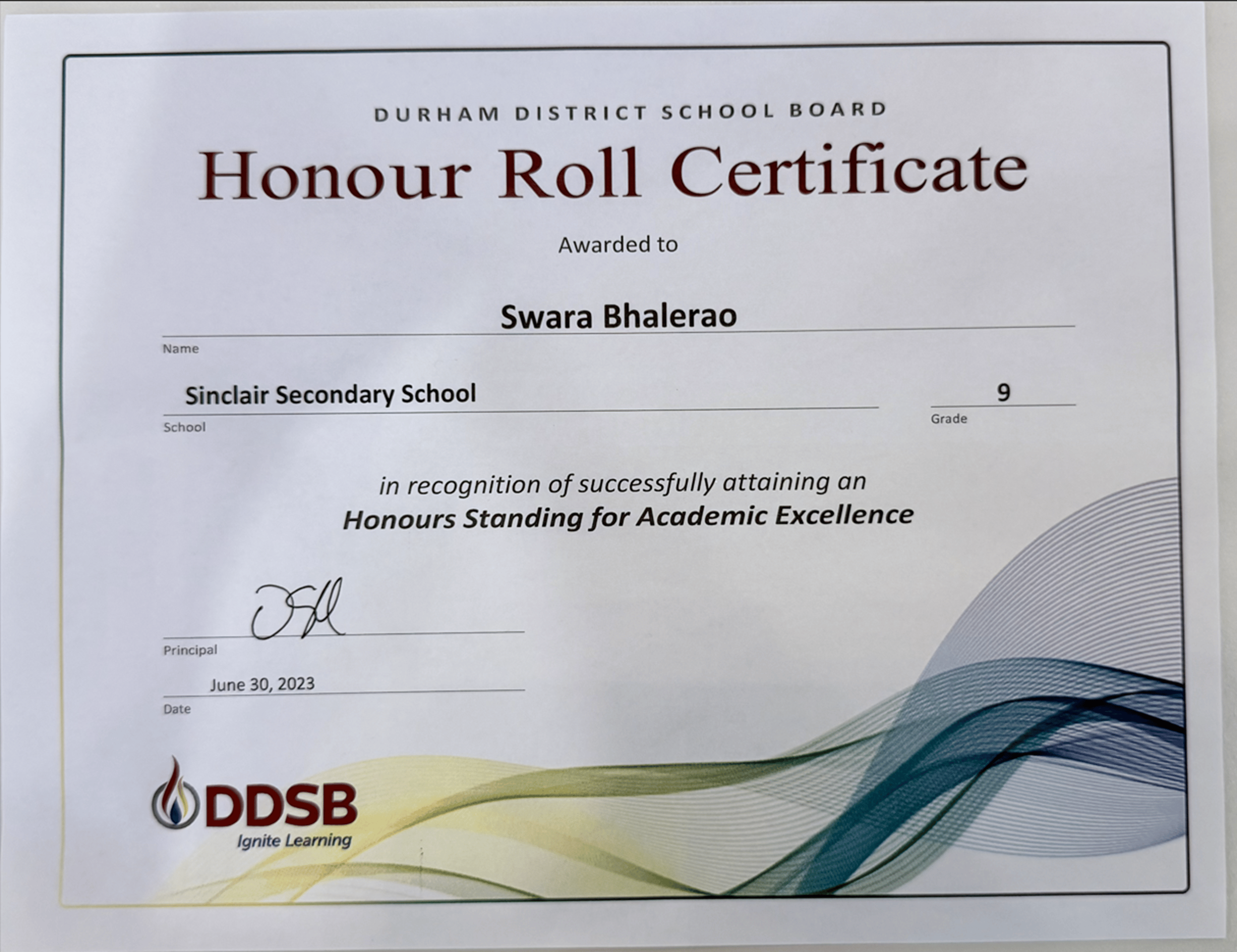 Honor Roll Certificate Grade 9