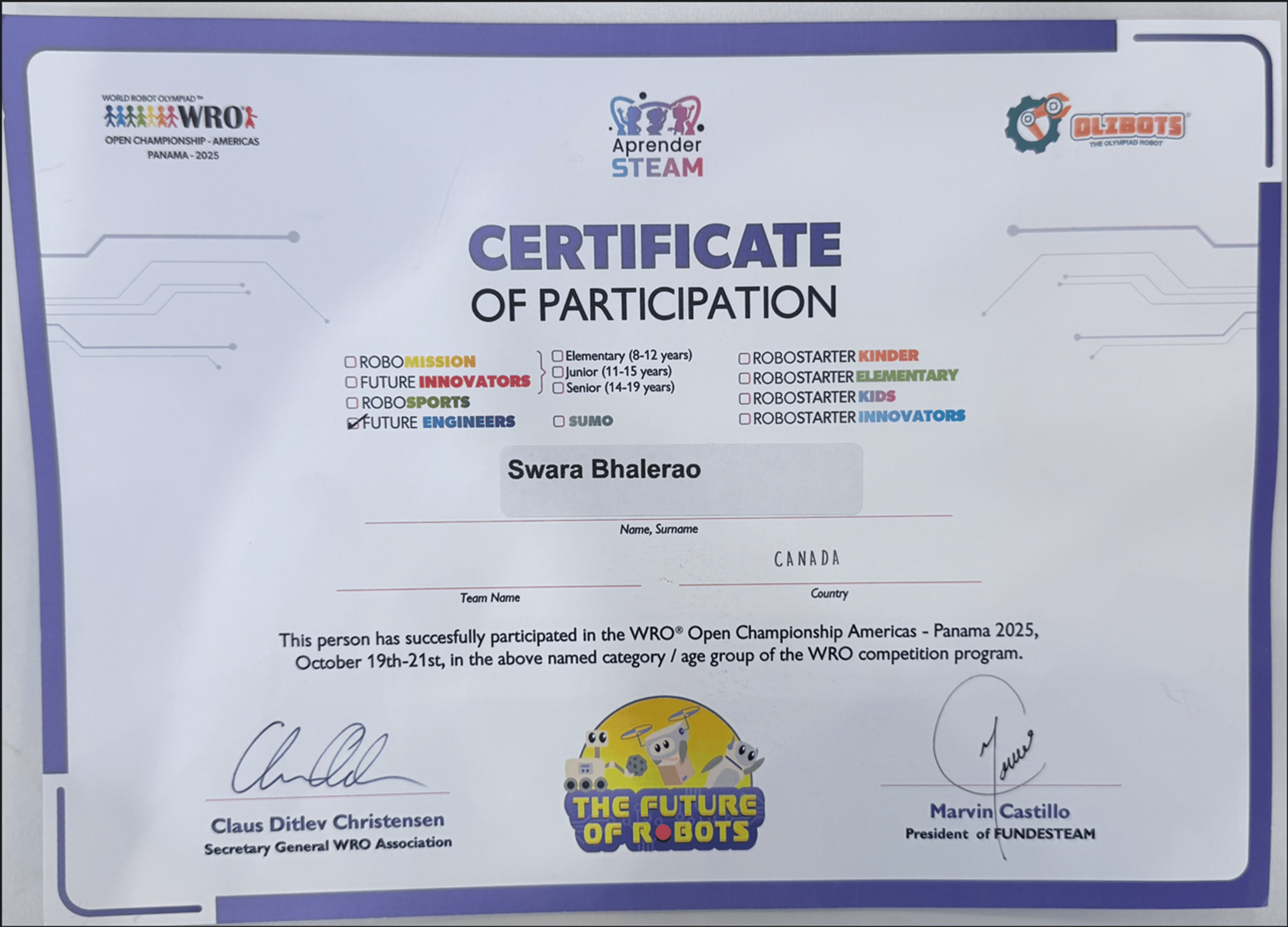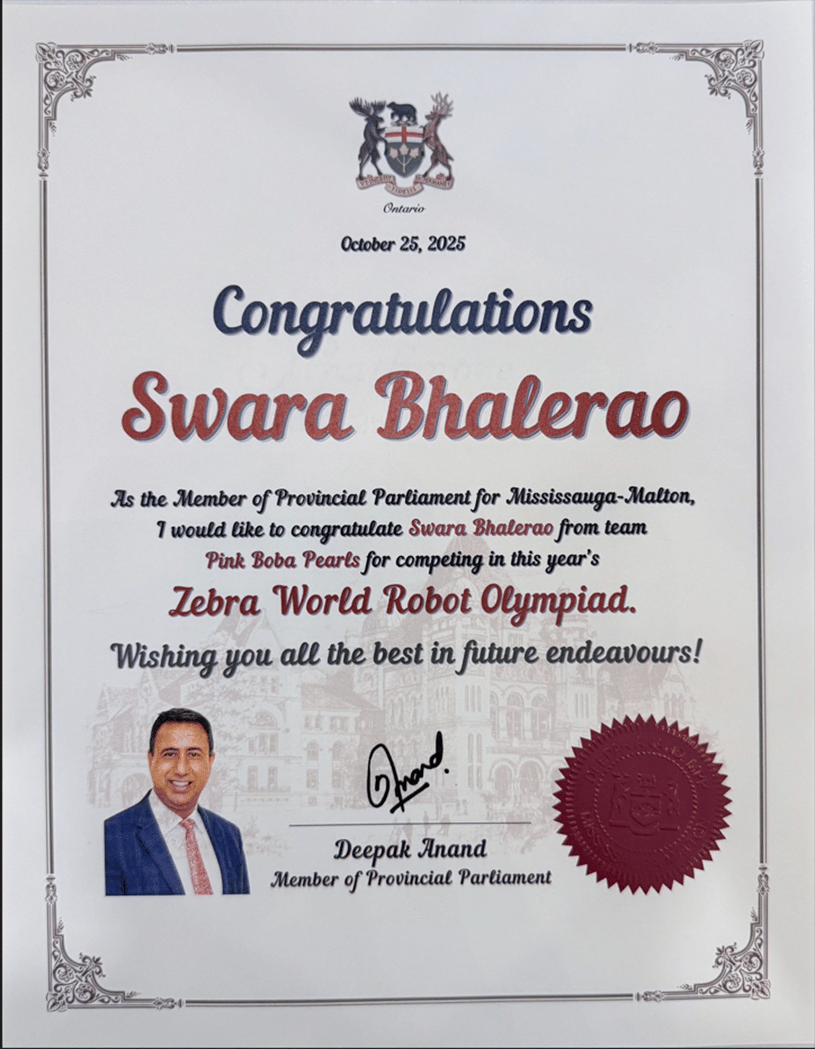 Member of Provincial Parliament, Mississauga-–Malton (Deepak Anand) - Award for Winning at International achieving 4th Place and 3rd place in Nationals - World Robotics Olympiad Future Engineers 2025