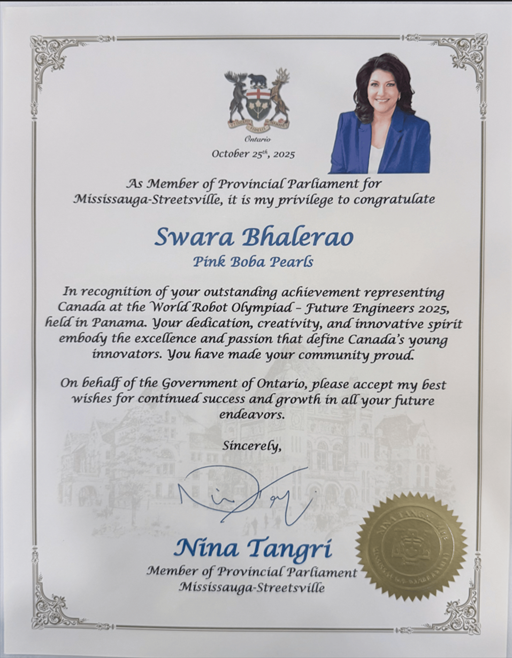 Member of Provincial Parliament, Mississauga-Streetsville (Nina Tangiri) - Award for Winning at International achieving 4th Place and 3rd place in Nationals - World Robotics Olympiad Future Engineers 2025