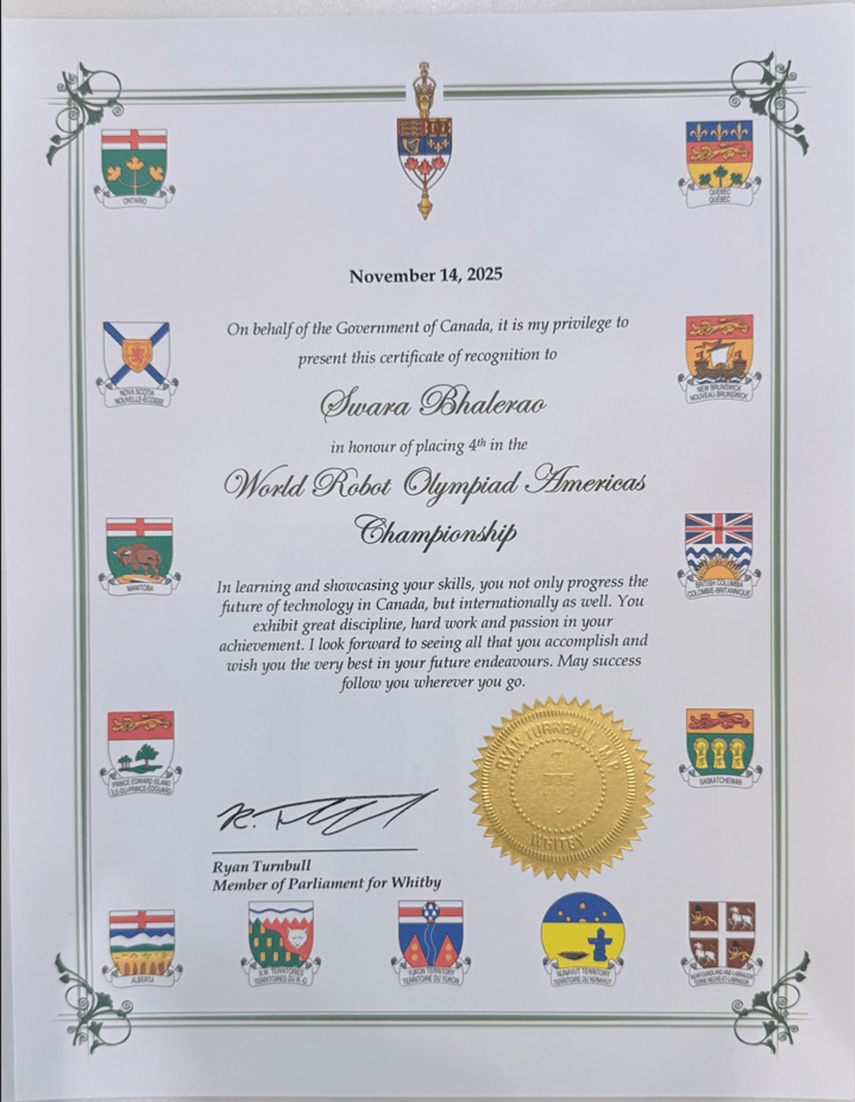 Member of Parliament, Whitby (Ryan Turnbull) - Award for Winning at International acheving 4th Place and 3rd place in Nationals - World Robotics Olympiad Future Engineers 2025
