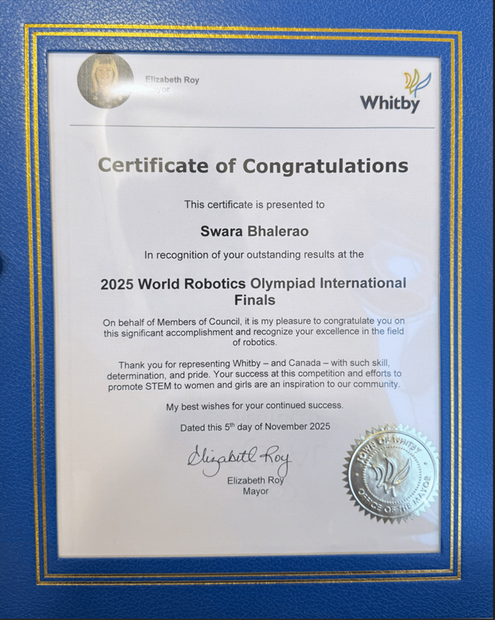 Mayor of Whitby (Elizabeth Roy) Award for Winning at International achieving 4th Place and 3rd place in Nationals - World Robotics Olympiad Future Engineers 2025