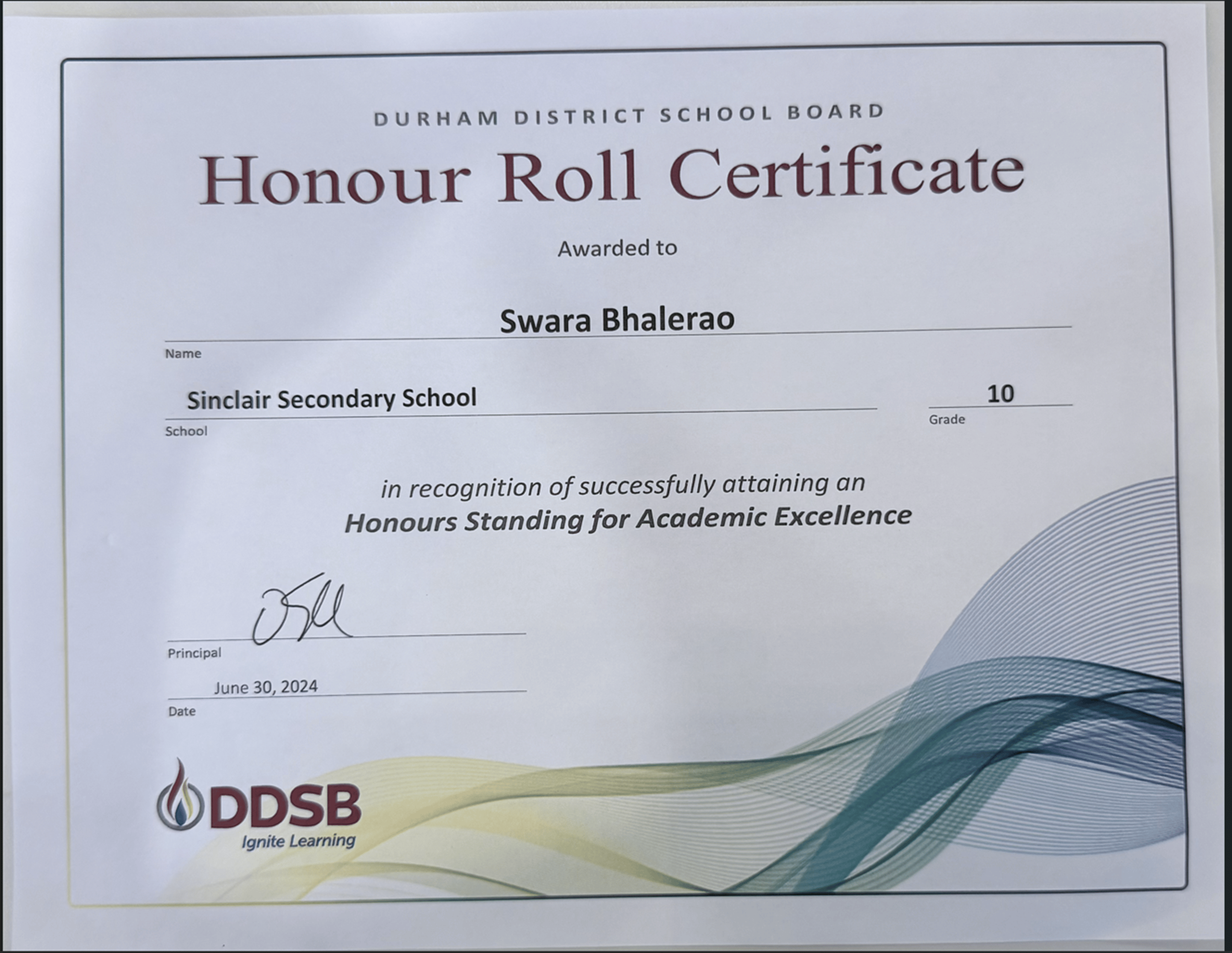 Honor Roll Certificate Grade 10